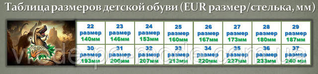 | Розмір дитячого взуття | Наявність потрібного розміру уточнюйте |